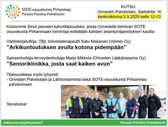 SOTE-osuuskunta Pirkanmaa järjestää oheisen tilaisuuden arkikuntoutuksesta Oriveden Palvelutalossa 2.9.2020.