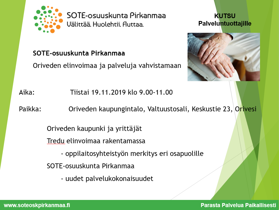 PS. Vastaava tilaisuus tullaan järjestämään Etelä-Pirkanmaalle, Akaalle tiistaina 3.12.2019 klo 18.00 alkaen.
